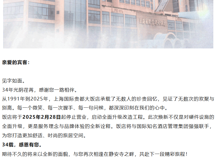 上海国际贵都大饭店发布停业公告,启动全面升级改造工程。(图/上海国际贵都大饭店公众号截图)