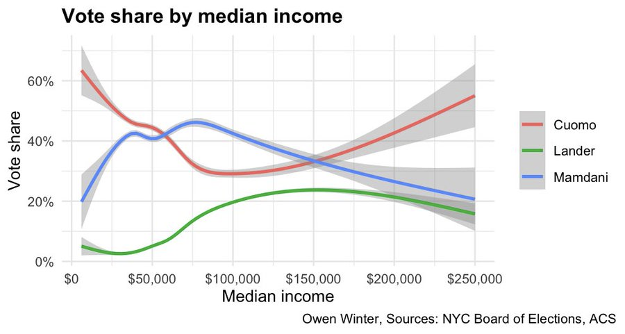 一项民调显示,超过40%的年轻选民认为路易吉的谋杀行为“可以接受”,其影响力仍在持续。2025年6月,33岁的州议员佐赫兰·马姆达尼以惊人优势击败前州长库默,赢得纽约市长选举民主党初选。舆论场中,马姆达尼被贴上“社会主义者”甚至“小共产主义者”的标签。根据《经济学人》政治数据记者Owen Winter的研究,这场胜利的关键,正是马姆达尼获得了中产阶级的绝对支持。