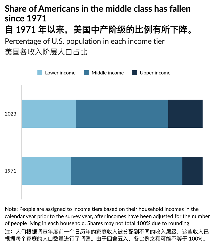 但随着经济衰退,越来越多的人跌落阶层。皮尤研究中心2024年11月的政府数据分析显示,美国中产阶级正在萎缩:1971年61%的美国人生活在中产家庭,2023年这一比例已降至51%。