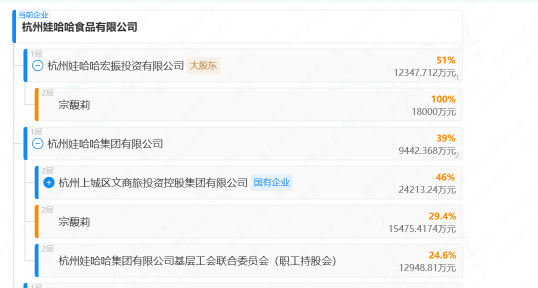 娃哈哈集团的股权结构目前由三方力量构成:杭州上城区文商旅投资控股集团作为国资代表持有46%的股份;宗馥莉通过继承其父宗庆后持有的29.4%股份已完成工商变更登记;剩下的24.6%股份由娃哈哈职工持股会持有,成为双方争夺的焦点。此前有媒体报道,目前职工持股会成员只有宗馥莉一人,这意味着职工会那24.6%的股权话语权已经全在宗馥莉手上。再加上继承的29.4%股权,宗馥莉理论上可以完全掌控娃哈哈集团。