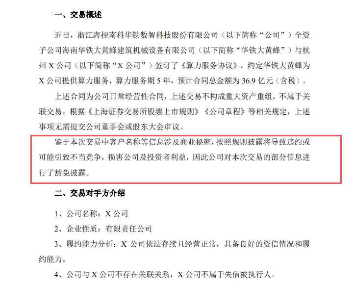 今年3月初,海南华铁发布公告称,其全资子公司海南华铁大黄蜂建筑机械设备有限公司(以下简称“大黄蜂公司”)与杭州X公司(下称“X公司”)签订了《算力服务协议》。协议约定,大黄蜂公司为X公司提供为期5年的算力服务,预计合同总金额为36.9亿元(含税)。