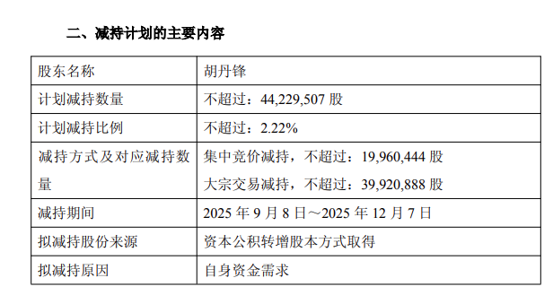 8月15日,海南华铁发布公告称,因自身资金需求,胡丹锋拟自本公告披露之日起15个交易日后的3个月内,通过集中竞价或大宗交易的方式减持不超过约4422.95万股,减持比例不超过总股本的2.22%。