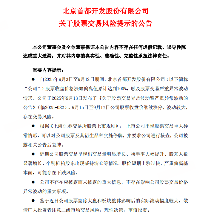 9月17日,首开股份再次发布关于股票交易风险提示的公告。公告显示,自9月3日至9月12日期间,公司股票收盘价格涨幅偏离值累计达到100%,触及股票交易严重异常波动情形。9月15日至9月17日,公司股票收盘价继续涨停,波动较大,存在明显的交易风险。近期,公司股票交易呈现出交易量明显增长、换手率大幅提升、股东人数显著增长、个别机构股东出现减持清仓等情况。股价短期上涨过快,严重偏离基本面,可能存在下跌风险。