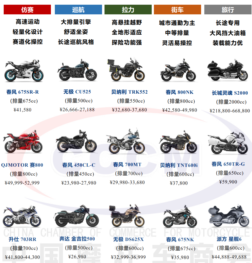 近年来,国内少数几家摩托车厂商也注意到了大排量摩托车的增长潜力,开始发力这一市场。在仿赛、巡航、拉力、街车、旅行等大排量摩托车的细分市场,国产摩托品牌的身影越来越多。例如:春风动力、钱江、无极摩托(隆鑫)、升仕摩托(大冶)、赛科龙(宗申)、长城灵魂、凯越摩托(珠峰)等品牌,都有不错的大批量车型。
