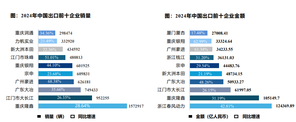 以出口为例,2024年国内出口第一位的重庆隆鑫摩托出口量为157.3万辆,产品以小排量代步摩托为主,实现出口金额10.5亿美元。相比之下,浙江春风动力出口数量都没有进入行业前10位(第10位出口量为19.8万辆),但是出口金额有12.4亿美元,高居国内摩企出口金额第一,隆鑫排名第二。这充分说明了大排量摩托车在出口市场上的优势。