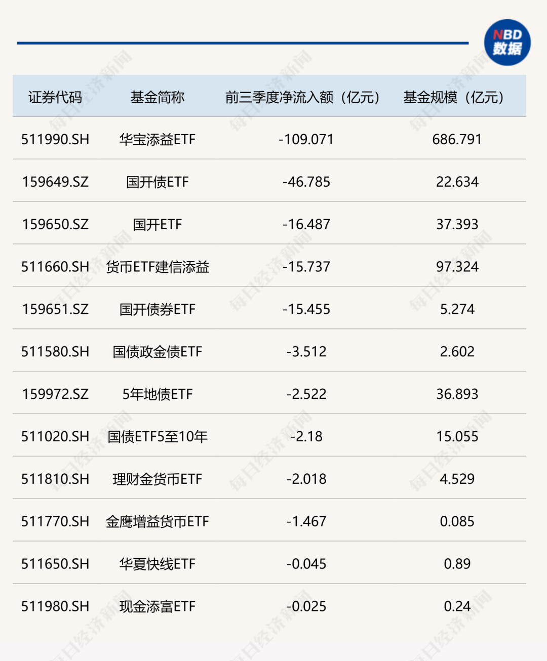 与债券型ETF的火热形成鲜明对比的是,货币型ETF遭遇资金大规模撤离。数据显示,华宝添益ETF前三季度净流出超百亿元,最新规模降至686.89亿元。分析认为,在存款利率下行周期中,若资本市场波动加剧,投资者对低风险理财产品的需求将持续升温。