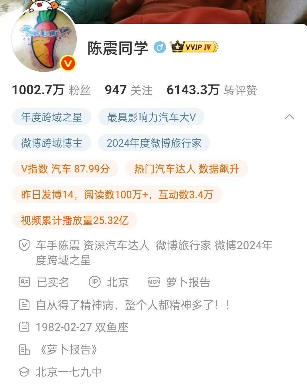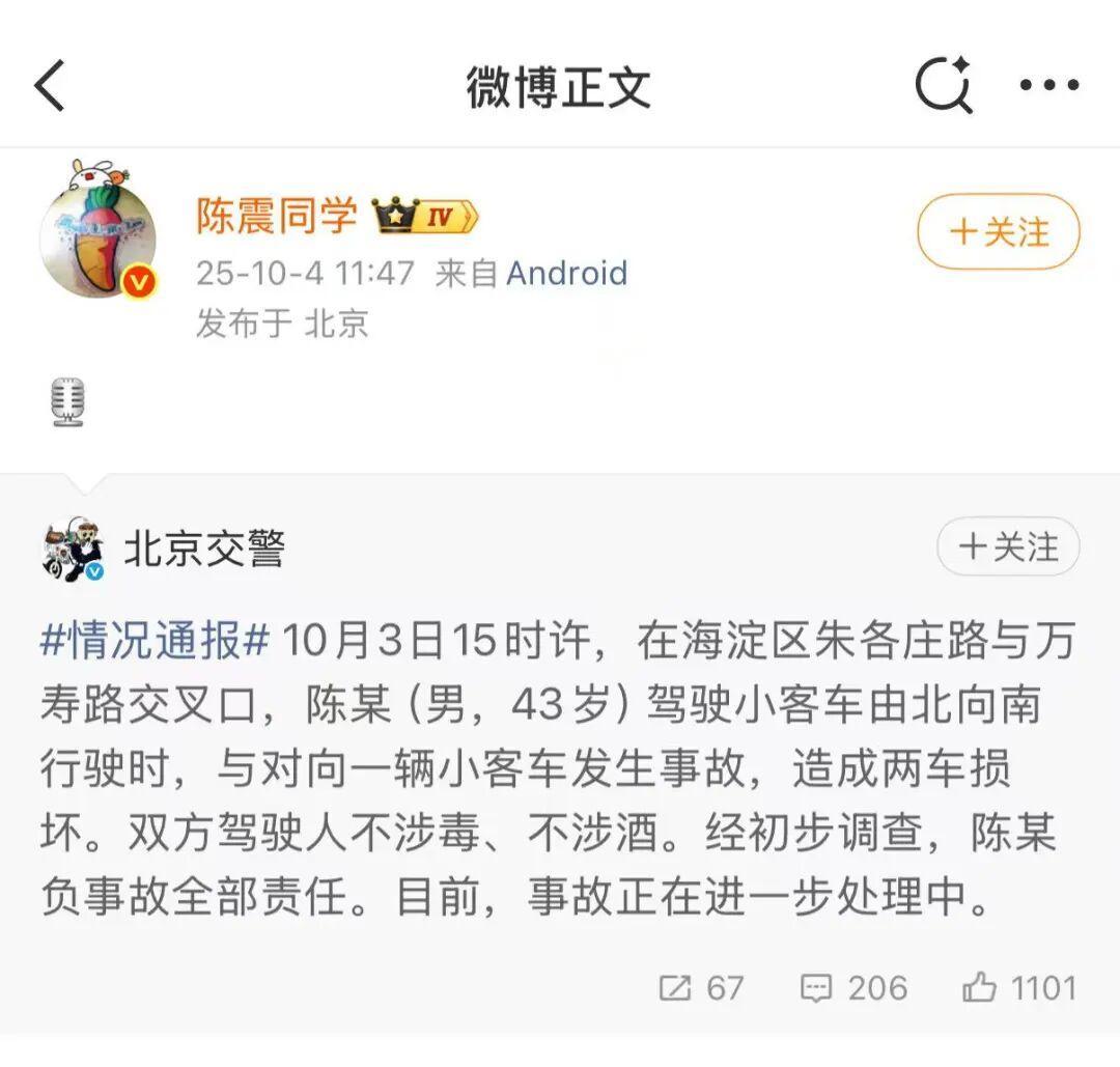 随后,知名车评人@陈震同学 在微博上转发了北京交警的通报,但未对事故细节进行更多说明。