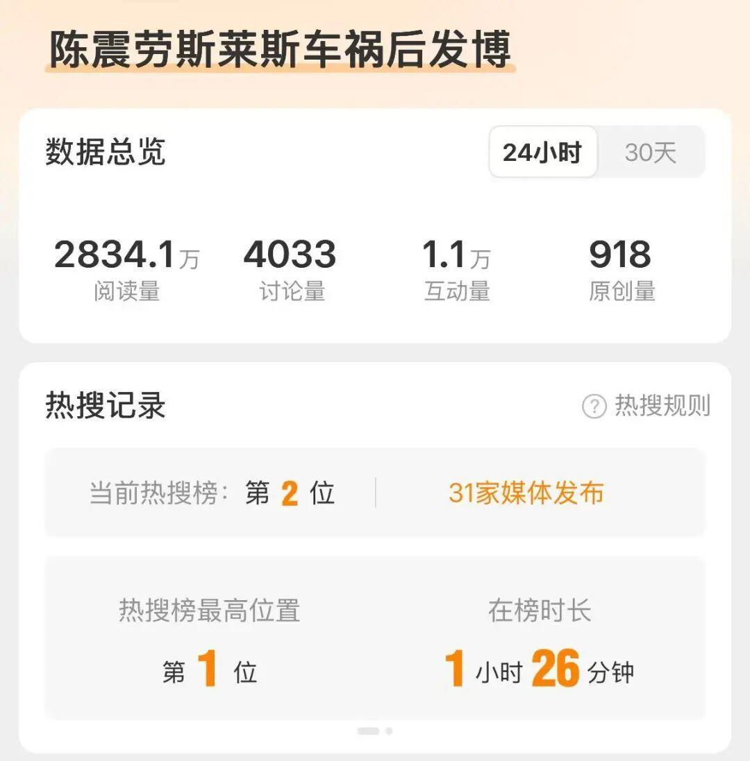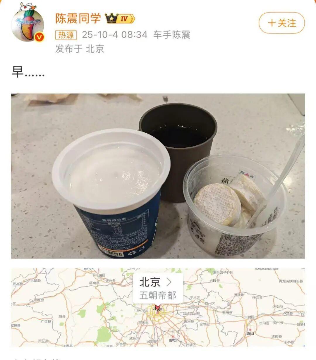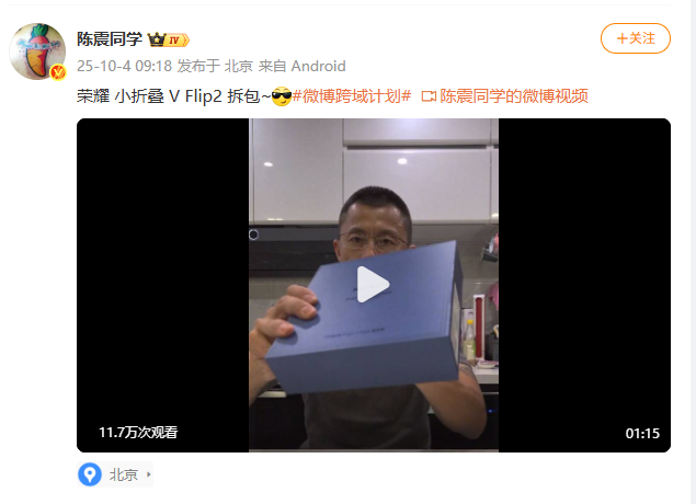 10月4日早上,陈震更新微博,仅发布了一个字“早”,随后又分享了一条“荣耀小折叠V Flip2拆包”视频,未对昨日疑似发生的交通事故作出正面回应。