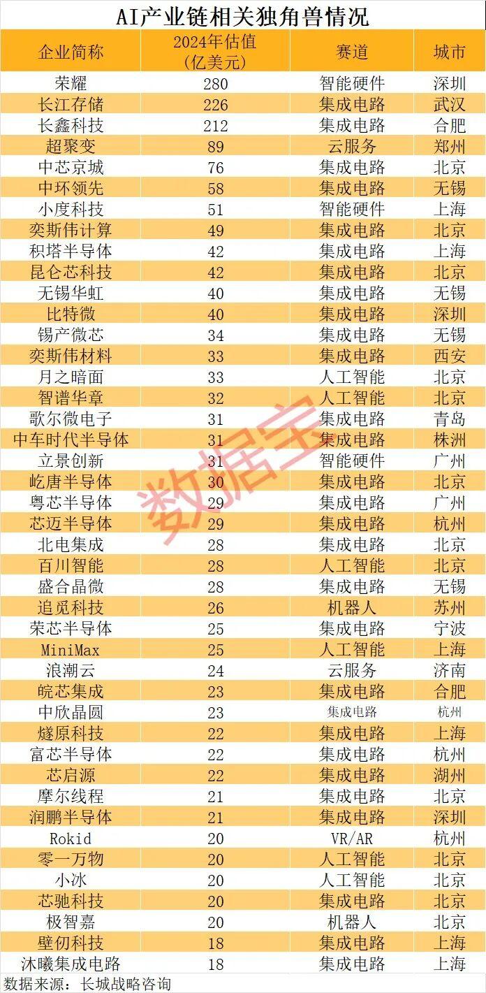 长城战略咨询《中国独角兽企业研究报告2025》显示,集成电路领域独角兽包括:长江存储、长鑫科技、中芯京城、中环领先、粤芯半导体、盛合晶微、燧原科技、摩尔线程、润鹏半导体、壁仞科技、沐曦集成电路等。AI产业链相关企业则有荣耀、超聚变、月之暗面、智谱华章等。