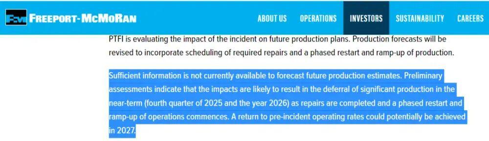9月24日,美国矿业巨头自由港公司披露了一则震撼市场的消息:其旗下全球第二大铜矿——印尼Grasberg铜矿在9月8日遭遇特大泥石流灾害。这场地质灾难导致80万吨湿性矿料涌入矿井,直接摧毁了矿区关键基础设施。迫于无奈,自由港公司宣布启动不可抗力条款,预计2025年四季度铜产量将锐减20万吨,2026年再减27万吨,直至2027年才能全面恢复生产。