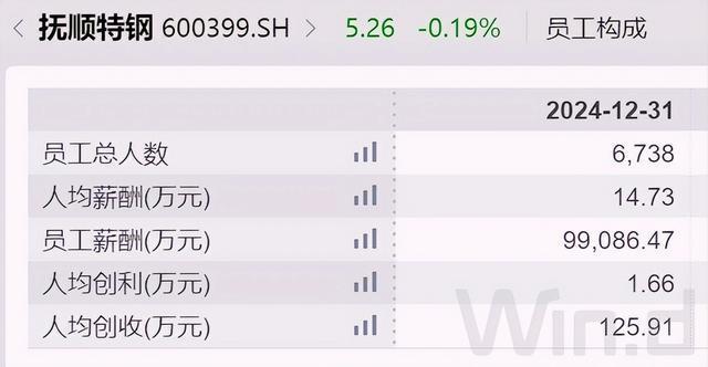 截至2024年末,抚顺特钢职工总数大约6700人,去年人均创利1.7万元,人均税前薪酬14.7万元,比2021年增加1.75万元。这一人均薪酬水平在抚顺市还是相当有竞争力的,体现了公司对员工的关怀和激励。
