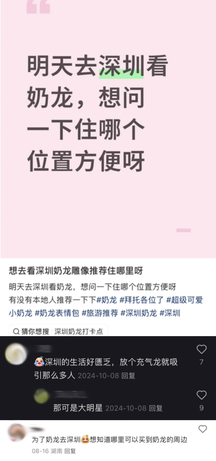 当有人无法理解深圳人为什么愿意为了一个气模在大太阳下挤到怀疑人生时,殊不知还真有人为了奶龙专门跑来这“文旅荒漠”一趟。