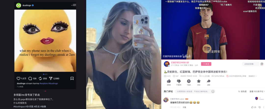 名人们也来“沾边”,多邻国借Gaga版眼妆奶龙提醒用户回归,加拿大歌手“z世代小甜甜”Tate McRae举着印有奶龙的手机壳自拍,巴塞罗那足球俱乐部拜年视频里,球员库巴西冷不丁来了一句“奶龙拜年”。以前是全世界都在说中国话,现在是全世界在被奶龙支配。