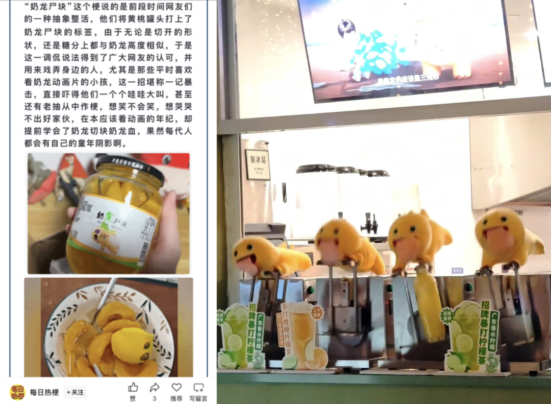 抽象的风同样吹到线下。黄桃罐头得名于“奶龙尸块”,迎来泼天的富贵,吐着舌头的奶龙在外卖大战里疯狂榨汁。
