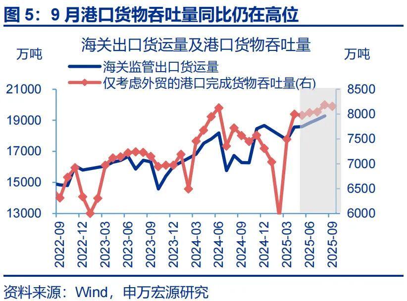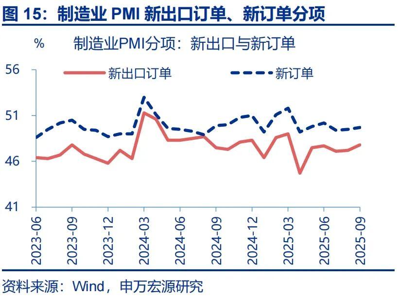需求结构延续外需好于内需的态势,表现为新出口订单回升幅度大于内需订单。拆分需求结构看,9月,内需、新出口订单指数均有回升,但新出口订单指数(+0.6pct至47.8%)上行幅度明显好于内需订单(+0.1pct至50%)。今年以来,外需改善叠加中国在新兴市场的份额提升,支撑出口持续超预期;高频指标显示,9月外贸货运量同比上行1.8pct至7.8%,说明出口仍维持韧性。