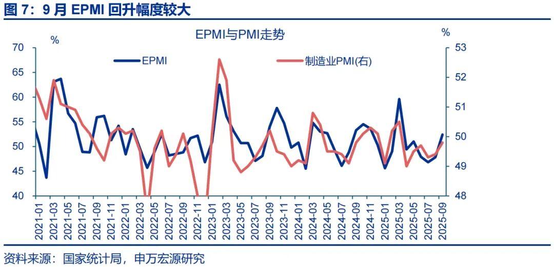 需求结构延续外需好于内需的态势,表现为新出口订单回升幅度大于内需订单。拆分需求结构看,9月,新出口订单指数(+0.6pct至47.8%)上行幅度明显好于内需订单(+0.1pct至50%)。今年以来,外需改善叠加中国在新兴市场的份额提升,支撑出口持续超预期;高频指标显示,9月外贸货运量同比上行1.8pct至7.8%,说明出口仍维持韧性。