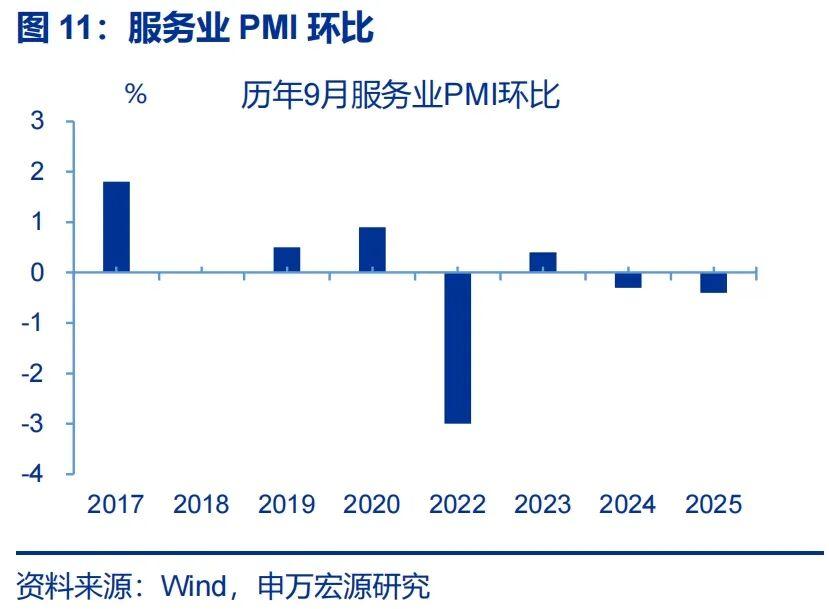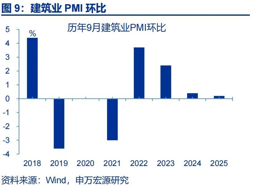 非制造业:非制造业PMI有所回落,主因服务业PMI下行幅度较大。9月,非制造业PMI回落0.3个百分点至50.0%。其中服务业PMI回落幅度较大,下行0.4个百分点至50.1%;相比之下,建筑业PMI指数回升0.2个百分点至49.3%。