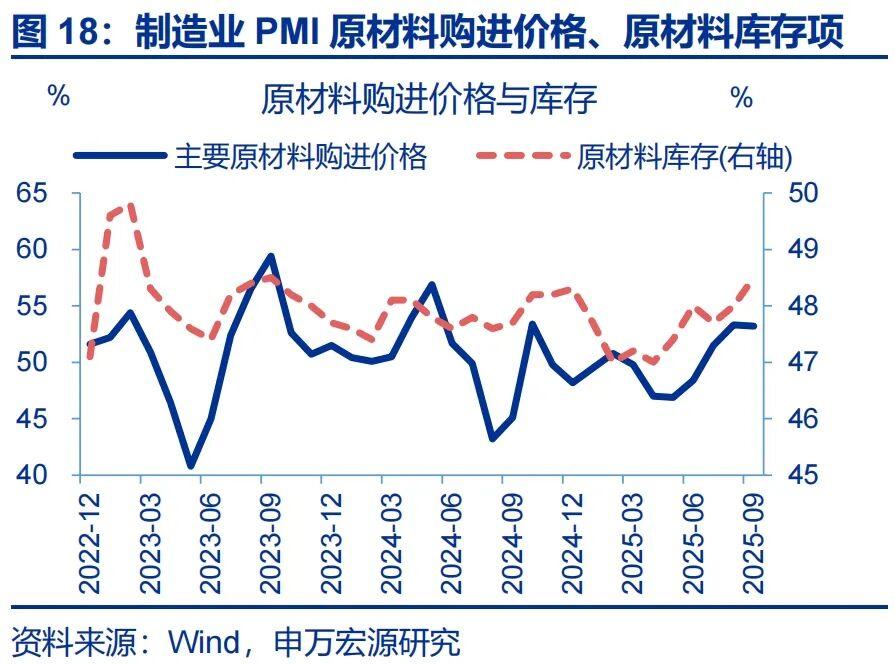 观察行业看,代表新动能行业的PMI改善幅度较大,一定程度对冲传统领域的PMI低迷。9月,装备制造业PMI上行1.1pct至51.6%,高技术制造业PMI保持在扩张区间(51.9%),显示出新动能积极改善。相比之下,高耗能行业PMI回落0.7pct至47.5%,或反映地产基建仍偏弱;相应地,前期回升幅度较大的基础原材料行业购进价格指数、出厂价格指数分别较上月下降2.2、4.5pct,9月PPI环比或有再度转弱的风险。