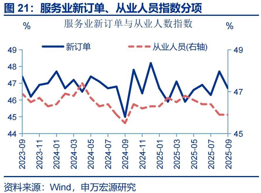 服务业:服务业PMI有所回落,新订单指数降幅较大。9月,服务业PMI环比下降0.4pct至50.1%。主要分项中,新订单指数下行1.0pct至46.7%。