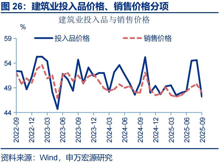 建筑业景气小幅回升,新订单指数涨幅较大。9月,建筑业分项中,新订单指数有所回升,边际上行1.6个百分点至42.2%。相比之下,从业人员指数有所下降,边际下行3.9个百分点至39.7%。投入品、销售品价格指数环比分别下行7.4个百分点至47.2%、1.6个百分点至48.1%。