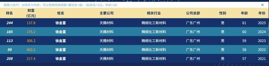 不过,近年来,随着竞争加剧,特别是上游产能扩张后,电解液价格自2023年起大幅下降。关键原材料产能和供应增长超过下游市场需求增长,导致全行业价格压力加大,2023年全年,天赐材料业绩大幅下滑,净利润同比下降68.5%,市场对公司盈利能力担忧加剧,股价持续走低,最大跌幅超40%,徐金富的身家也受到影响,2025年,其身家回落至137.8亿元,位列创富榜第244名。