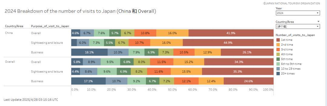 “去中心化”与“深度体验化”的融合,使日本旅游呈现出远高于传统模式的复购特征。JINTO数据显示,2024年中国游客中首次访日者占比为41.9%,高于全球平均的34.3%。更值得注意的是,有10.7%的游客曾三次以上赴日旅游,甚至有6%的游客选择二十次及以上。