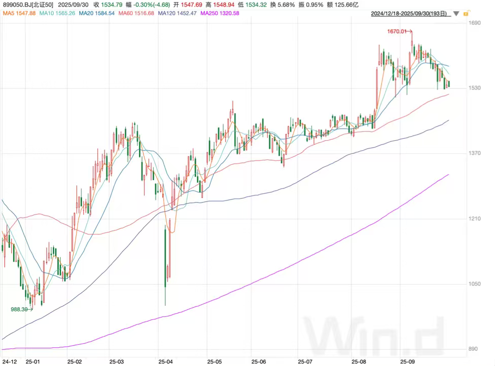 在A股市场持续走强的同时,北交所也迎来爆发式增长。北证50指数年初至3月中旬快速回补去年末跌幅,4月后跟随A股展开第二轮上涨。尽管期间经历调整,但截至9月30日,年度累计涨幅已达47%,显著跑赢多数主板指数。