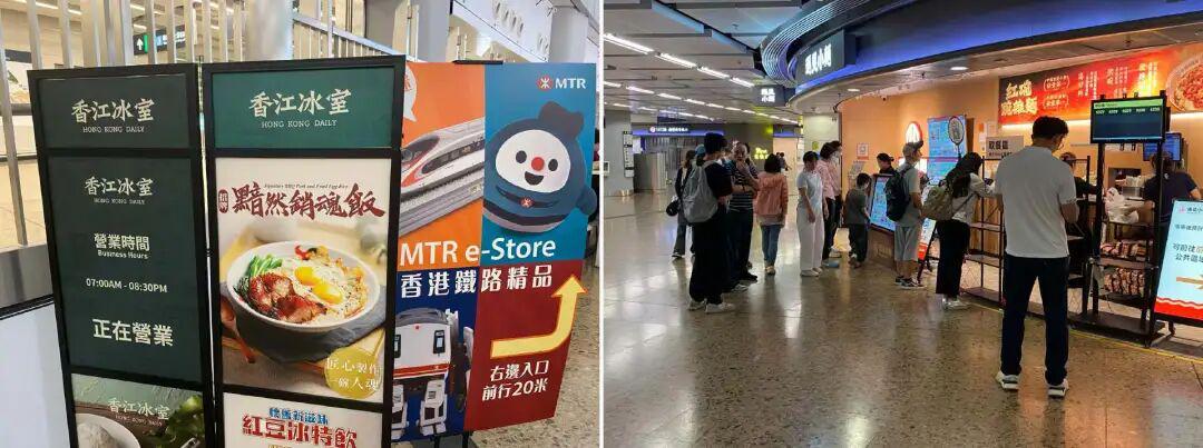 其次冷的是一些香港特色的餐饮,九记牛腩的排队与平时差不多,在十一期间的用餐高峰期,九记牛腩门口的排队也不过十几个人,大概20分钟就可以吃到。一些香港的特色高端餐饮,门口并没有队伍,10月3日晚上七点左右,正是用餐的高峰期,中环人流如织,但沿街的一些特色餐厅也没有坐满,甚至还有一些服务生在门口招揽顾客。10月4日下午,在高铁西九龙站,主打香港特色的香江冰室门可罗雀,但主导平价的内地品牌遇见小面却排起长队。