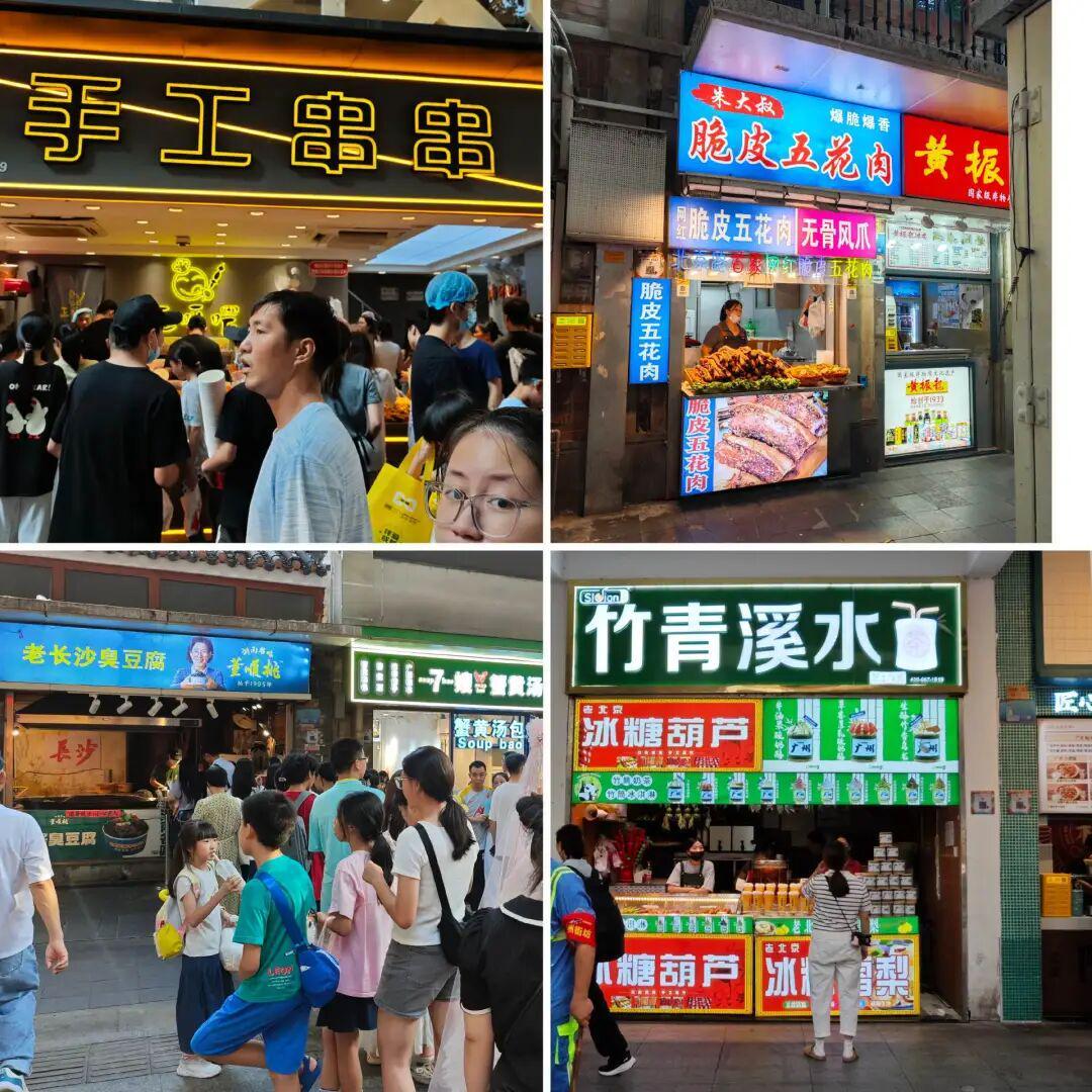 这条夜市可能是内参君逛过最大的夜市。炭火翻滚的烧烤摊旁,香气混着桂花醪糟的甜味弥散开来;炸臭豆腐撒上辣椒面、油亮亮地冒着热气;再来一碗清补凉解腻,正是感受市井生趣的好时机。