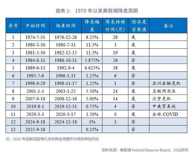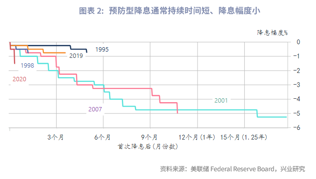 不同降息周期的特征:从历史经验看(如图2所示),预防型降息(如1984、1995、1998、2019和2024年)通常表现为持续时间短、降息幅度小;而衰退型降息(如1974、1981、1989、2001和2007年)则往往持续时间更长、幅度更大。此外,2020年因新冠疫情引发的降息周期具有时间极短、节奏极快、斜率陡峭等特征,故作为特例单独列出分析。