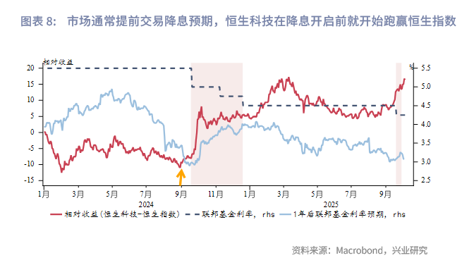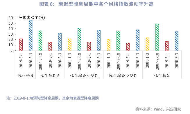 在风格方面,根据图5的统计结果,除恒生科技指数外,其余风格(如市值风格下的大盘与小盘,以及红利风格)在历次降息周期中均未走出独立行情,其走势与恒生指数高度同步,未形成持续性的超额收益或显著跑输。从波动特征来看(图6),衰退型降息期间的区间波动率明显高于预防型降息。而在预防型降息周期中(图7),以2019年为例,恒生科技指数呈现出“高胜率、高收益”的特征。这主要源于降息推动分母端折现率下行,有利于成长风格表现,因此恒生科技在降息后上涨概率较高。这主要由于成长股作为长久期资产,其现金流更多分布于远期,当分母端折现率(尤其是降息预期快速增强)下降时,其估值修复弹性通常优于价值股。但需要注意的是,降息开启并不等同于风格切换的起点。由于市场通常会提前交易降息预期,成长风格往往在降息正式实施前就已走强(如图8所示)。
