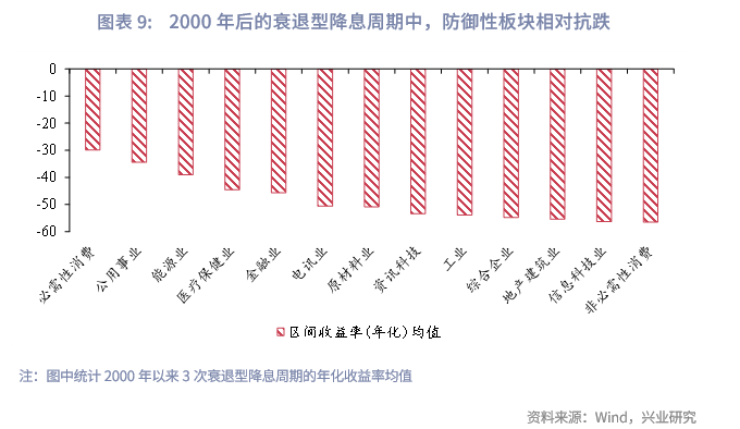 3)行业层面:遵循“衰退防御、预防成长”的演绎逻辑,在衰退型降息中,市场风险偏好回落,具备防御属性的板块如公用事业、必选消费等通常表现更佳, 而在预防型降息中,科技、医药等高成长行业占优。