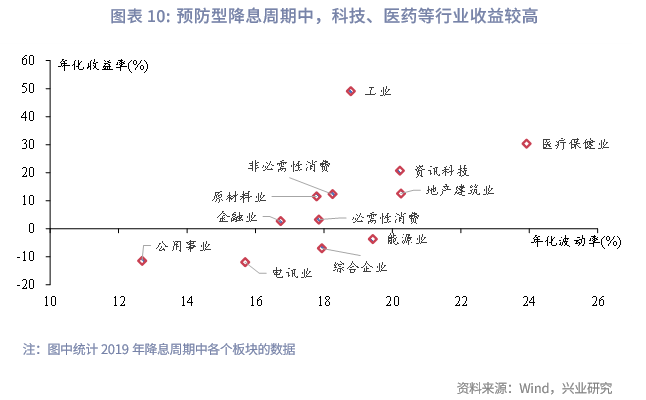 在行业层面,不同类型的降息周期呈现出明显的结构性差异。如图9所示,在衰退型降息中,市场风险偏好下降,具备防御属性的板块如公用事业、必选消费等通常相对抗跌,其稳定的盈利与需求韧性提供了一定安全边际。而在预防型降息中,科技、医药等行业不仅受益于分母端折现率下行带来的估值提升,也往往迎来投融资环境的改善;此外,工业类板块在融资成本下降的推动下,也可能实现盈利与估值的双重提振(图10所示)。