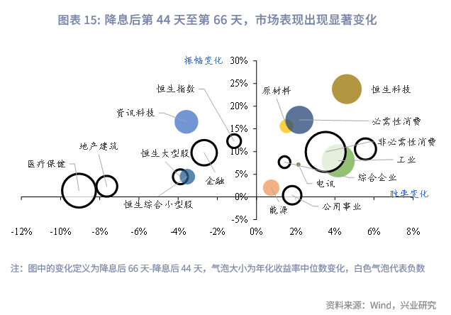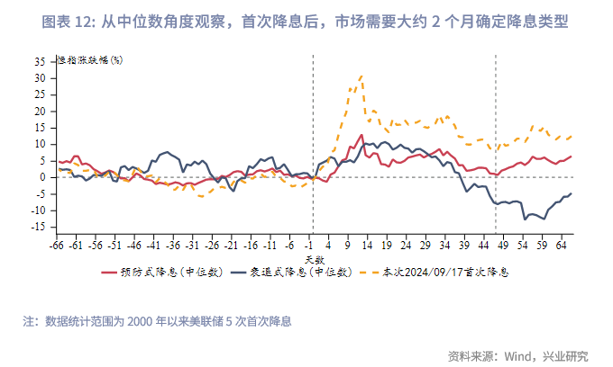 基于历史数据的中位数统计,我们发现市场通常需要约2个月时间来初步识别降息周期的性质(预防型或衰退型,如图12)。因此,我们重点考察了首次降息后44个交易日(约2个月)与66个交易日(约3个月)的窗口表现。数据显示:
