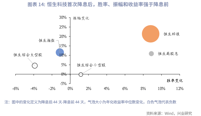 2)风格方面:除恒生科技指数外,其余风格(如市值风格下的大盘与小盘,以及红利风格)在历次降息周期中均未走出独立行情。预防型降息周期中,恒生科技指数呈现出“高胜率、高收益”的特征。