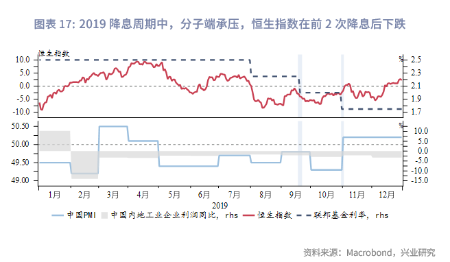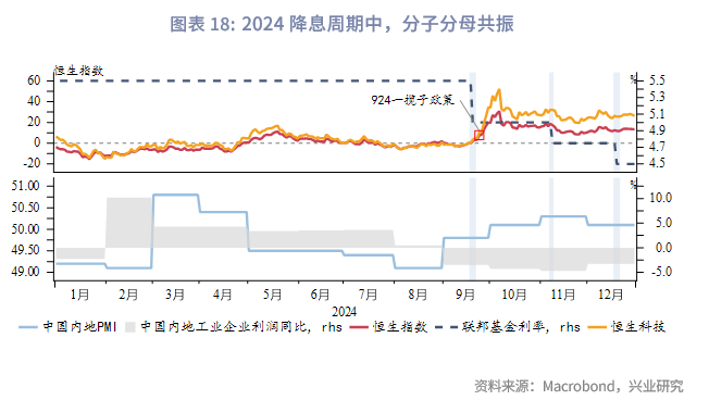 究其根本,美联储降息主要作用于资产定价中的分母端(无风险利率),而分子端的盈利表现,尤其是中国基本面的影响,往往同样关键。如图17-18所示,同样是美联储降息,2019年虽处于美联储降息周期,分母端条件趋于宽松,但由于当时国内经济基本面偏弱,企业盈利持续承压,分子端的拖累导致港股仍出现大幅下跌,这正是典型的分子端主导定价的案例。与之形成对比的是2024年,在美联储降息预期提供分母端支撑的背景下,中国内地“924”一揽子政策进一步成为关键驱动力,该政策通过降低存量房贷利率等举措,从根源上改善居民收入预期与企业盈利前景,进而推动分子端与分母端实现正向共振,共同促成了港股的显著反弹。