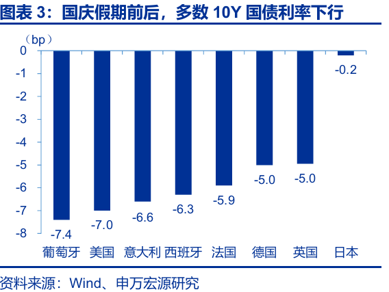国庆假期前后(9月29日-10月6日),主要发达国家的长期国债收益率多数回升。受美国政府关门等影响,10Y美债收益率下行7.0bp至4.13%。其他债市方面,10Y德债下行5bp至2.71%,10Y葡萄牙、意大利、西班牙、法国、英国、日本国债利率分别下行7.4bp、6.6bp、6.3bp、5.9bp、5.0bp、0.2bp。