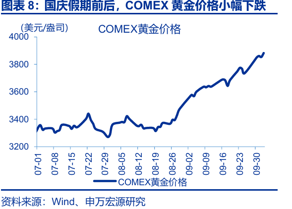国庆假期前后(9月29日-10月6日),油价大幅走弱、金价大幅上涨。原油方面,在市场对OPEC+国家于11月再度“增产抢份额”的担忧下,油价大幅下跌,WTI原油、Brent原油分别下跌7.4%、8.0%至60.9美元/桶、64.5美元/桶;10月5日,沙特与俄罗斯达成一致,OPEC+八个产油国仅在11月增产13.7万桶/日、远低于彭博此前援引消息人士报道的50万桶增产幅度,油价应声补涨。而随着美债利率的回落、美国政府关门风波的冲击,黄金价格继续攀升,COMEX金大涨4.0%、再度刷新新高。