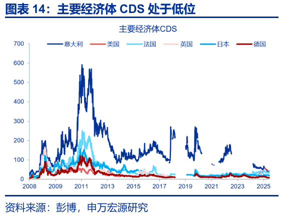 从国别风险来看,未来需关注英国、法国等经济体的债市风险。可结合债务供给端和需求端因素判断哪些经济体风险相对更高。供给端视角看,法国、德国,均处于债务升高,赤字升高的象限。英国政府债务率扩大16个点,法国债务率扩大15个点,大于其他经济体。需求端视角看,法国、英国国债投资者结构中,海外投资者占比较高,分别达50%和31%,其中法国国债的海外非银投资者占比达27%。但二者一方面没有美债的安全资产属性,另一方面也缺乏德国的低债务率安全垫,导致其易受海外投资资金减持的影响。日本海外投资者占比仅14%,相对风险较低。