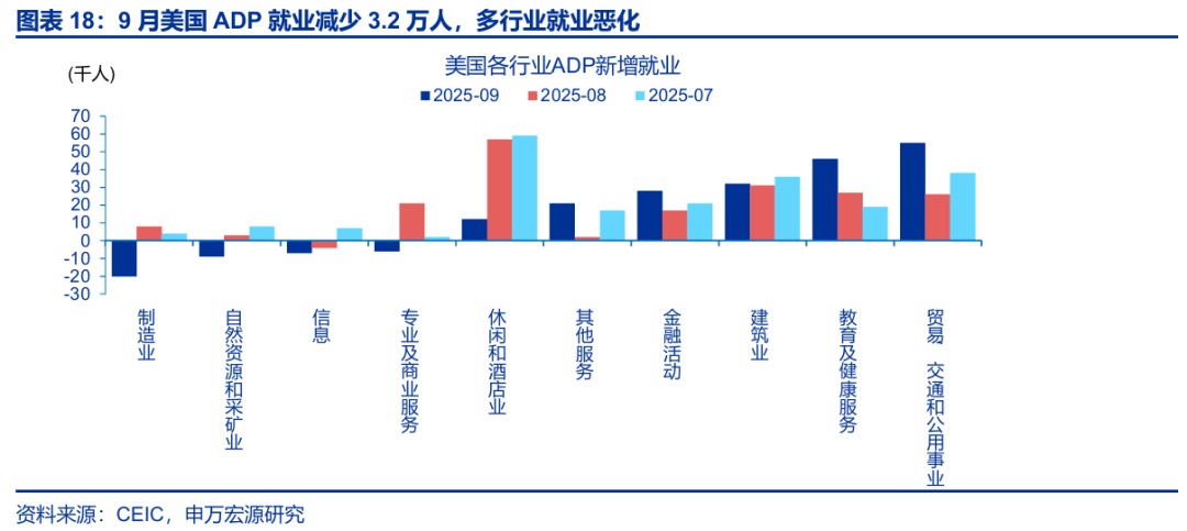 9月美国ADP就业减少3.2万人,低于市场预期。由于美国政府关门,非农数据推迟发布,私营机构发布的就业数据重要性提升。9月美国ADP就业减少3.2万人,市场预期增加5.1万人。首先,此次ADP就业数据受到“年度基准调整”影响,根据ADP声明,校准导致9月就业人数减少了4.3万人。但是,即便剔除技术性影响,美国就业走弱的趋势仍在持续,无论是商品还是服务业均能看到这一点。