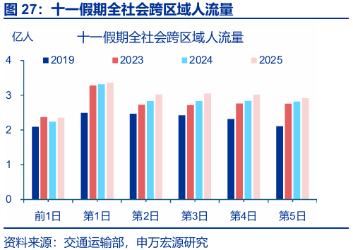 要闻:2025年十一假期第1-5日,全社会累计跨区域人员流动量15.4亿人次,日均人流量同比4.9%,较五一假期回落3.1pct。