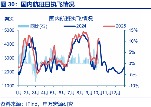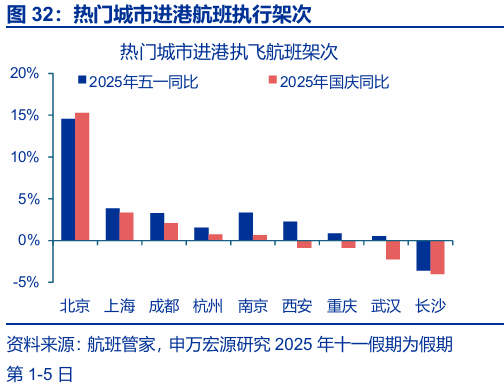特征二:从节奏看,十一假期出行呈现前置特征,但整体仍不及五一假期。交通运输部预计,假期前半程部分旅客呈现错峰出行特征。数据上十一假期前3-5天(9月26日-28日,周五-周日)人流出行强度达到阶段性高位,全国迁徙指数同比14.5%、超过假期(同比1.2%);跨区人流也可印证上述趋势,十一假期前1天全社会跨区人流量同比为5.2%、超过假期首日(同比1.4%)。但假期前5日与假期内结合看,十一假期全国迁徙指数同比-0.7%、仍然不及五一假期(22.2%)。分交通方式看,错峰出行以自驾为主,十一假期前1天,非营业性小客车日均人员出行量同比为6%、超过假期首日出行强度(同比0.6%),而假期前3-5天国内航班执飞同比降至-2.7%。