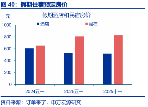 特征五:价格表现整体平稳,民宿、机票预售价格较五一假期有所回升。截至9月28日,十一假期预售机票价格(裸票价)平均为804元、高于去年同期(736元)、今年五一假期(778.9元)的均价。住宿方面,截至9月29日,十一假期酒店、民宿预定率分别为37.1%、38.5%,较五一假期回落6.1、9.2pct,可能也受居民出行前置影响。价格方面,酒店价格环比回落1.9%,民宿价格较五一假期有所回升、环比2.2%。
