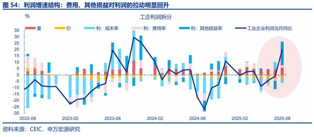 8月利润大幅回升,源于低基数下费用、其他损益等短期因素对利润的拉动明显提升。8月,工业利润当月同比回升21pct至19.8%。从影响因素看,利润率边际改善主要是费用、其他损益(投资收益、营业税金及附加等杂项支出)等短期指标对利润同比的拉动明显回升,分别+3.8pct至2.2%、24.8pct至18.3%,但其更多与去年基数较低及今年8月资本市场表现强劲有关。