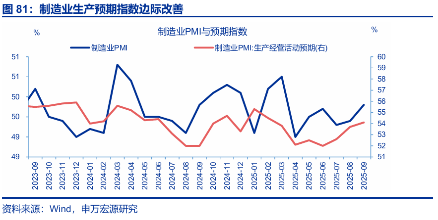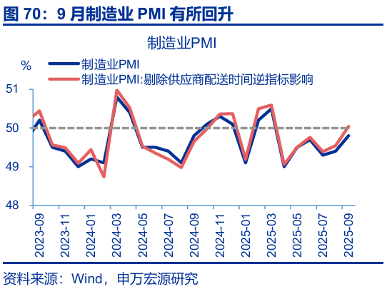 制造业方面,9月PMI积极改善,结构上呈现生产指数修复好于新订单的格局。9月制造业PMI较前月回升0.4pct至49.8%,剔除受天气因素影响较大的供应商配货指数后,本月实际PMI上行0.5pct至50%,整体表现符合季节性。从主要分项看,原材料购进价格(-0.1pct至53.2%)、出厂价格指数(-0.9pct至48.2%)保持韧性下,生产指数升至近6个月高点(51.9%),较前月上行1.1pct,明显好于季节性(0.3pct)。而新订单指数回升幅度不及往年同期(0.6pct),较前月仅上行0.2pct至49.7%。