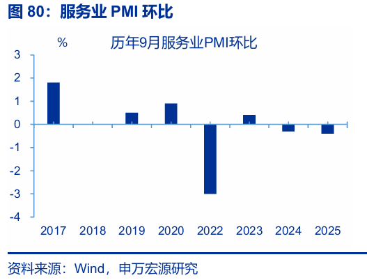 非制造业方面,建筑业PMI持续低迷,服务业PMI受暑期效应消退的影响也有回落。9月,非制造业PMI降至临界点。其中,建筑业PMI仅较前月回升0.2个百分点,整体仍在历史低位(49.3%)。服务业PMI较前月回落0.4pct至50.1%。从行业看,受暑期效应消退影响,与居民出行消费密切相关的餐饮、文化体育娱乐等行业商务活动指数落至临界点以下;对比之下,邮政、电信广播电视及卫星传输服务、货币金融服务等行业商务活动指数均位于60.0%以上高位景气区间。