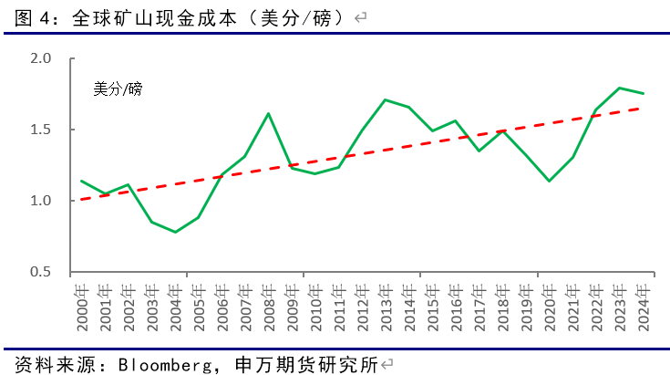 根据彭博统计的主要矿企财报数据,全球铜矿山现金成本(C1)逐年上升。2000年时,主要矿山现金平均成本仅为1.0美分/磅左右,随着高品位矿脉开采枯竭,全球矿山品位逐年下降,现金成本也逐年提升,2024年主要矿企的平均现金成本攀升至约1.75美分/磅。全球研究机构估计,全球铜矿完全成本(C3)90%分位线大约在8,600 - 8,900 美元/吨(约3.90 - 4.05 美元/磅)。