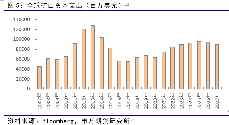 随着矿山品位的逐年下降,铜精矿完全成本逐年抬升,铜价下方支撑也逐年提升。另外,全球主要矿企资本支出近些年增速逐年下降,也可能导致未来新增矿供应增速明显放缓。