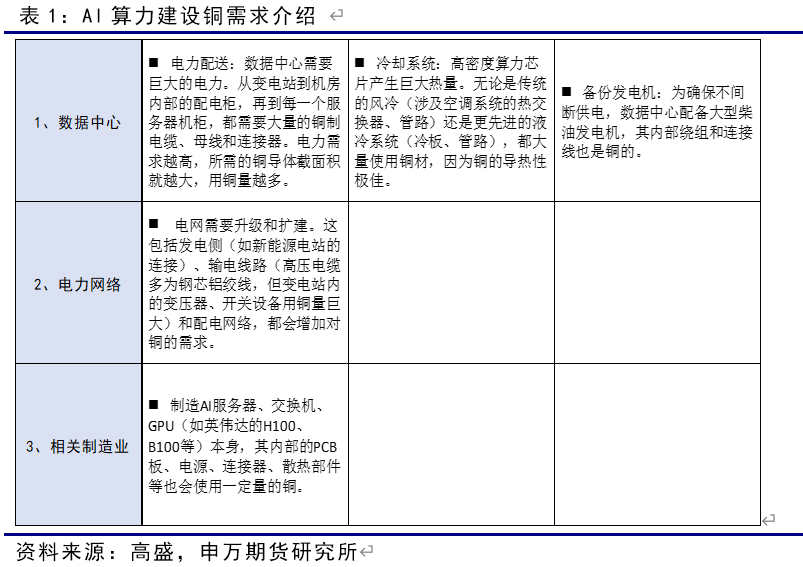 高盛在2024年3月的报告中预测,到2030年,数据中心对铜的新增需求将从2023年的约20万吨/年增长至50万吨/年。AI数据中心每兆瓦的用铜量比传统数据中心高出约80%,主要原因是更密集的布线和高效率的冷却系统。此外,支持数据中心的电网建设也将带来额外的需求。