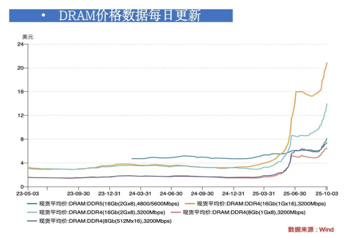 其次,10月1日凌晨,OpenAI发布了Sora2,这款视频模型仅用四天就冲上了美国App Store免费榜第一。机构认为Sora2是视频模型的GPT3.5时刻,将进一步引爆算力需求。相比于文字,视频大模型对存储提出了更高的要求。据国金电子数据,上周DDR5 16G/DDR4 16G/DDR3 4G均价为8.129/20.87/2.413美金,相较上周同比+8.75%/+6.70%/+4.91%,相较上月同比+34.36%/+32.82%/+26.40%,过去一月现货价涨幅扩大。从股市表现来看,存储领域的美光、闪迪、SK海力士以及芯片代工的台积电等最为强势。